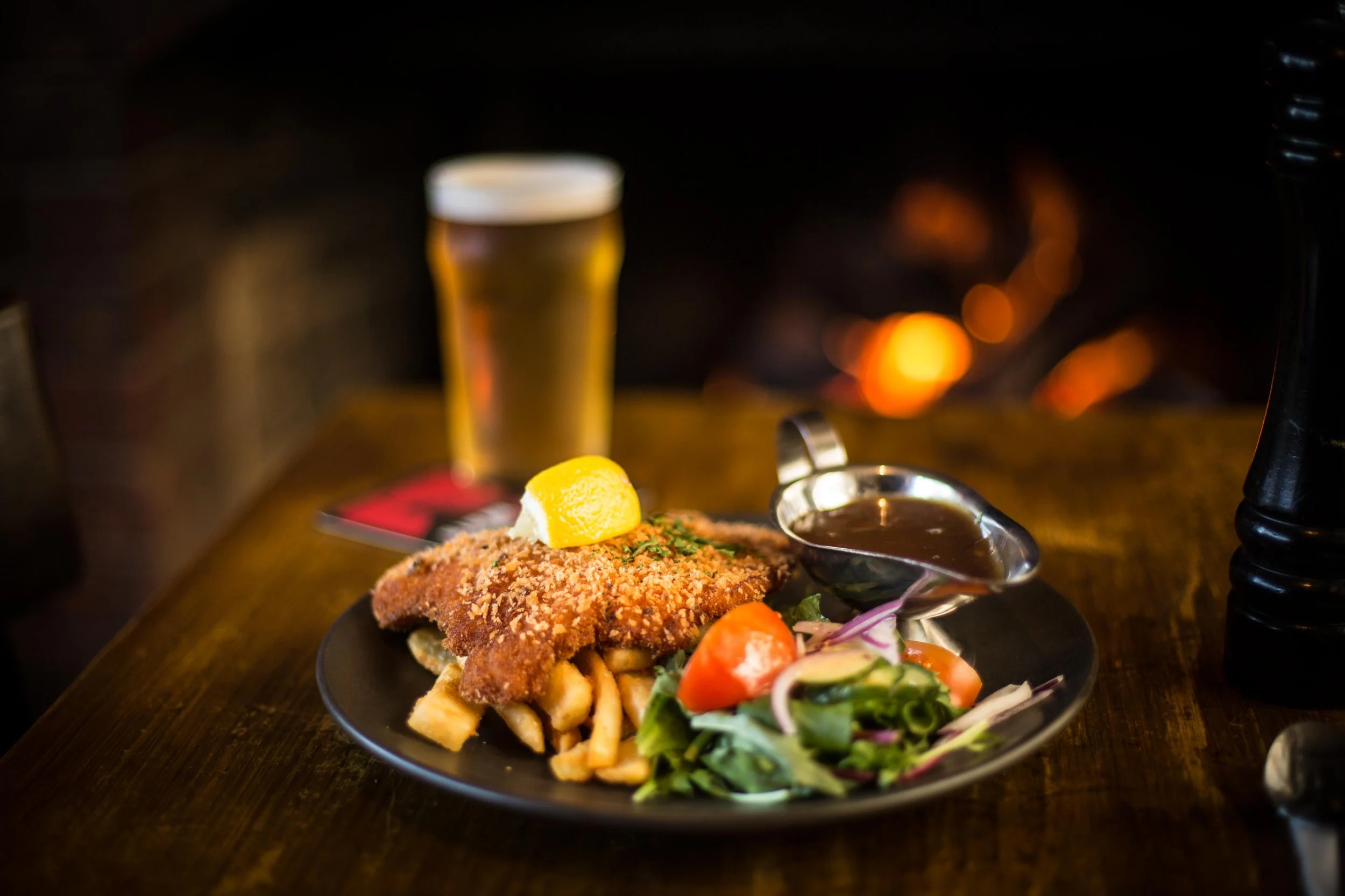 Schnitzel or Guinness pie with chips and salad for $20 or a Chicken Parmi with chips and salad for $22